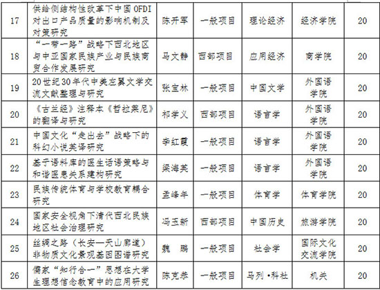 各学院获准项目分布情况为:文学院5项,外国语学院4项,教育学院3项,法学院3项,心理学院2项,社会发展与公共管理学院2项,经济学院2项,商学院、体育学院、旅游学院、国际文化交流学院、机关等各1项。