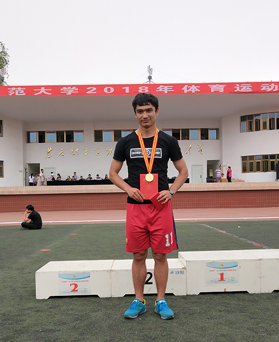 准备,起跑,冲刺!11秒67后,2014级物理与电子工程学院物理学3班托合提阿吉率先冲过终点,捧得冠军奖杯。大二的时候,托合提阿吉就为自己设立了五连冠目标:在五年大学生活中(含一年预科),100米比赛中都要夺冠。“今天终于梦想成真,现在都不知道该怎么表达了,真的很高兴!”