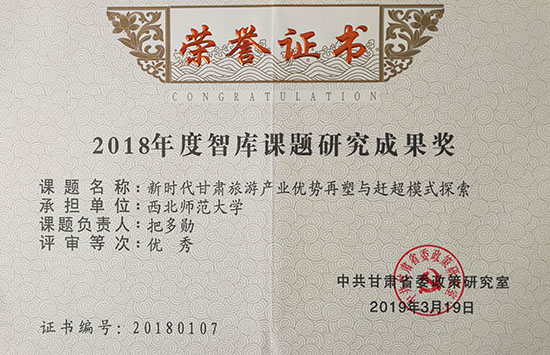 近日,西北师大旅游学院把多勋教授团队智库研究项目“新时代甘肃旅游产业优势再塑与赶超模式探索”再获甘肃省委政研室智库课题研究成果奖(评审等次为优秀),并以成果专报形式报送省委省政府主要领导参阅,这是把多勋教授团队连续第二次获得该项奖励。
