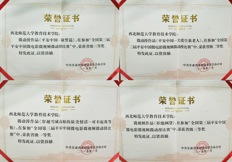 近日,全国第三届平安中国微电影微视频微动漫比赛结果揭晓,西北师大教育技术学院张晓涛、徐晓燕、盛雪冰、苏超丽团队制作的微动漫作品《穿越雪域高原的最美情话---对不起我等你》荣获省级一等奖;宗晓、马丽琴、李晓红、刘志武团队制作的微动漫作品《平安中国---关爱空巢老人》荣获省级二等奖;郝美、郭舟团队制作的微动漫作品《平安中国---狱警篇》荣获省级三等奖;屈庆祥制作的微视频作品《拒绝网贷》荣获省级三等奖。
