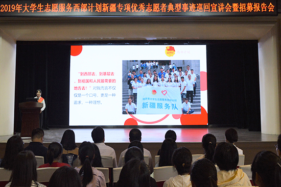 4月26日,“到西部奋斗,让青春出彩”2019年大学生志愿服务西部计划新疆专项优秀志愿者典型事迹巡回宣讲暨招募报告会在西北师大举行。共青团新疆维吾尔自治区党组书记、团委副书记赵川,共青团甘肃省委副书记董安宁,西北师大副校长张生勇和甘肃省青年志愿者指导中心负责人、宣讲团成员及学生代表350余人参会。