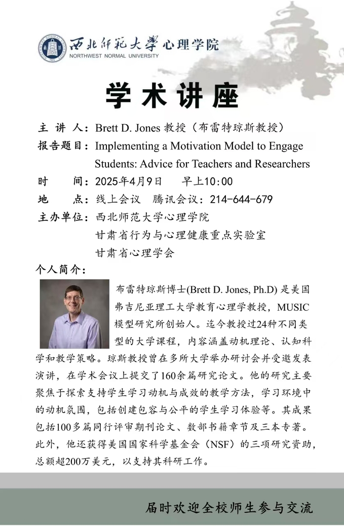 布雷特琼斯博士(Brett D. Jones, Ph.D),美国弗吉尼亚理工大学教育心理学教授,MUSIC模型研究所创始人。主要从事探索支持学生学习动机与成效的教学方法,学习环境中的动机氛围,包括创建包容与公平的学生学习体验等研究。获美国国家科学基金会(NSF)的研究资助项目3项,项目总额超200万美元;在多所大学举办的研讨会上受邀发言,并提交研究论文160余篇。