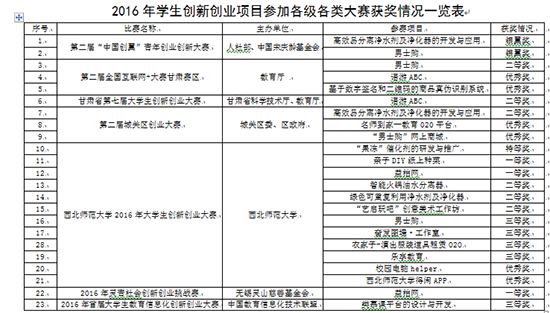 2016年,我校学生在第二届“中国创翼”青年创新创业大赛、第二届全国互联网+大赛、甘肃省第七届大学生创新创业大赛、2016年灵青社会创新创业挑战赛、2016年首届大学生教育信息化创新创业大赛、第二届城关区创业大赛等赛事中获得各类奖项18项。其中“银翼奖”2项(国赛)、省级一等奖1项、省级二等奖3项,省级三等奖1项、省级优秀奖5项、省级优秀指导教师1项、省级优秀组织奖2项、市级优秀奖2项,63个大学生创业团队在各类比赛中展露风采。
