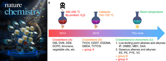 该研究团队在之前催化反硫化反应的基础上,针对传统反硫化苛刻的高温条件及所产生的一系列副反应,首次实现了光促进室温反硫化技术。该方法的亮点:Ⅰ)非常温和的温度条件 (18-20 °C);Ⅱ)拓宽了交联剂的范围,将低沸点烯烃、炔烃以及更便宜和丰富的气体交联剂纳入到反应体系中;Ⅲ) 省去了固化步骤,缩短了反应时间;Ⅳ)避免了有毒的 H2S 气体副产物的生成,反应过程更加绿色环保;Ⅴ)大多数情况下无需额外添加助催化剂;Ⅵ)无自膨胀效应,实验过程更加安全可控。
