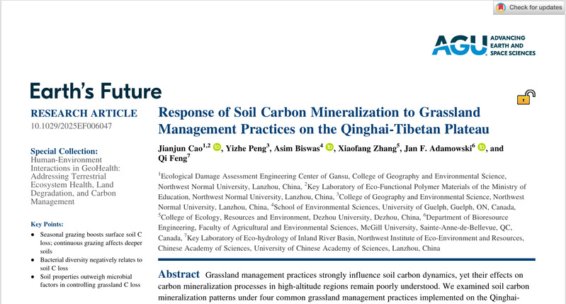 近日,地理与环境科学学院曹建军团队在青藏高原草地管理与碳循环研究方向取得重要突破,研究成果以“Mechanisms of Grassland Management Impacts on Soil Carbon Mineralization”为题发表于《Earth's Future》期刊。该期刊由美国地球物理学会(AGU)主办,聚焦地球系统与人类活动交互关系研究,是环境变化与可持续发展领域具有重要国际影响力的学术期刊。