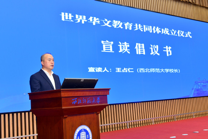 仪式现场,王占仁宣读倡议书,阐明共同体将秉持“共商、共建、共享、开放”的原则,构建全球华文教育机构、实践者与研究者的合作平台,携手谱写华文教育发展新篇章。